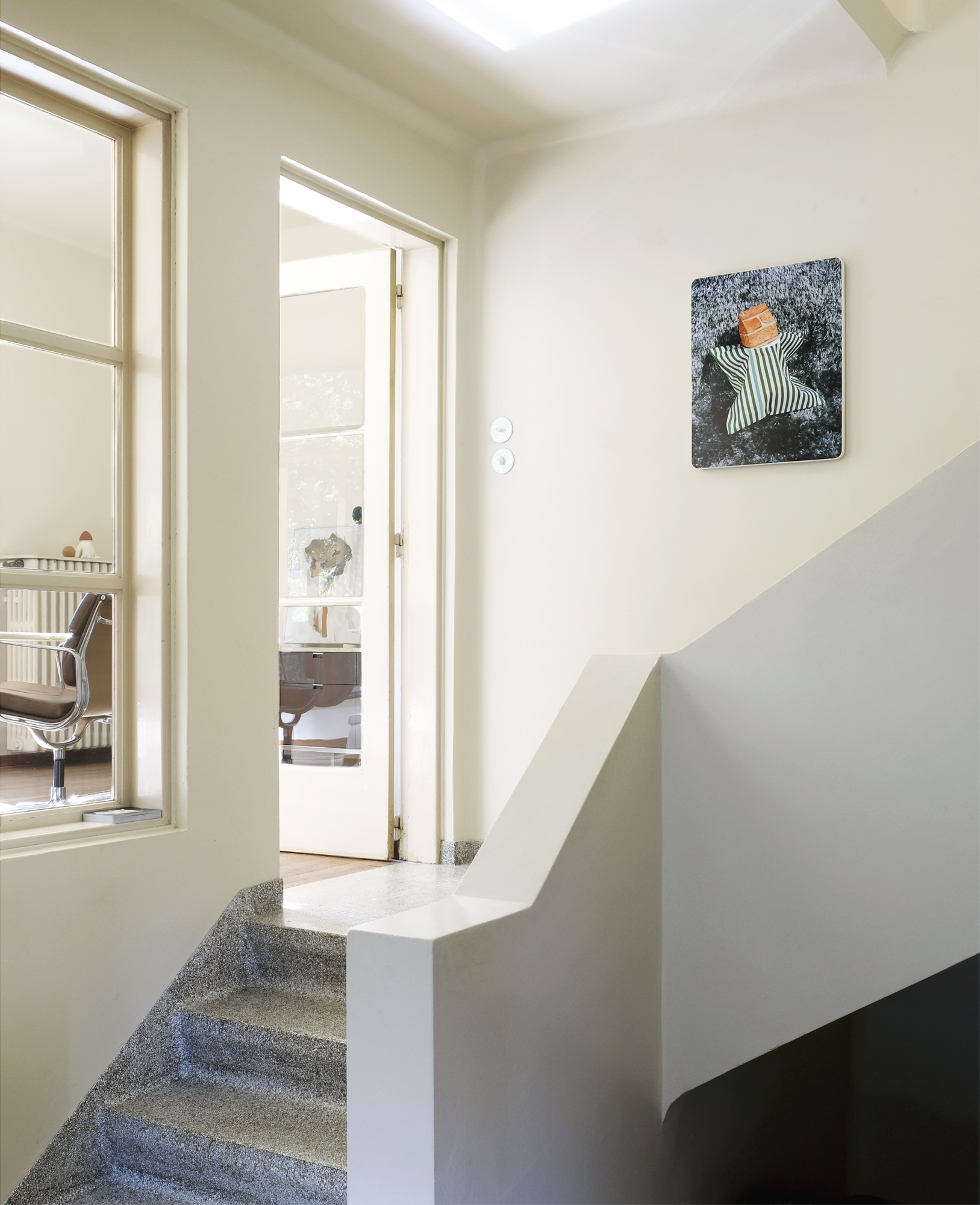 A carton of milk covered-up with brick-patterned vinyl becomes a kind of house emerging from a striped bag, standing off a polarized grey carpet evoking a grass lawn, whilst on another picture, a knee pad meets a grinding wheel covering up pliers.